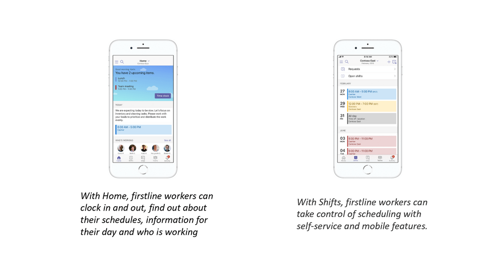 On mobile devices the Microsoft Teams application will also get a new Home tab. With Home, the so called ‘firstline workers’ can clock in and out, find out about their schedules, information for their day and who is working.